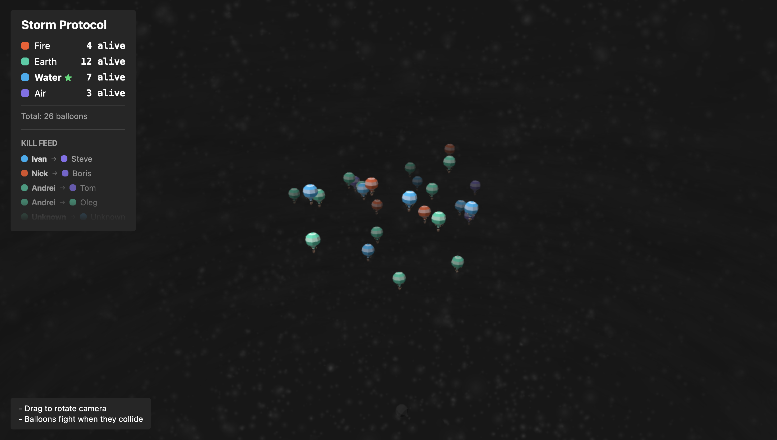 Try to predict winner and join a squad that you believing is the best. Game starts when hot air balloons will spawn inside a hurricane arena. From there, it's pure physics: balloons drift toward random targets, collide, and when two meet, one pops. No player control. Last nation with a balloon in the air wins. Everyone on the winning team splits the reward pool-even if your balloon died early. The final survivor gets a bonus on top.